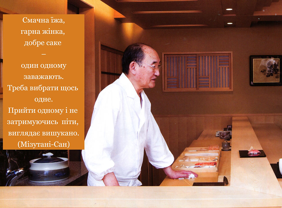Мізутані-сан: У моєму ресторані, зразу після легкої закуски «Сашімі», я пропоную вже суші, «Саке» хіба що трохи.