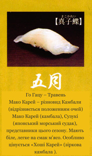 Мізутані-сан: «Що можна з’їсти лише у цю пору року?», якщо так запитати, то для мене це буде приємно, бо я підбираю меню з врахуванням сезону. І для клієнтів теж це одне із задоволень відвідати суші ресторан, маючи можливість насолодитися смаком риби цього сезону.
